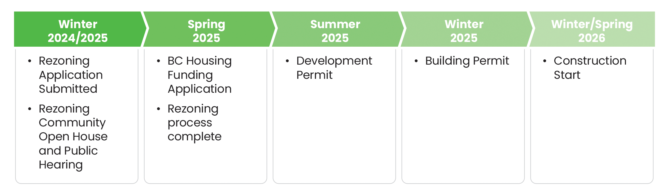 The OCP amendment and variances have been approved by the Nelson City Council. Following rezoning, a Development Permit and Building Permit will be required. The graphic below provides an overview of the project schedule.
